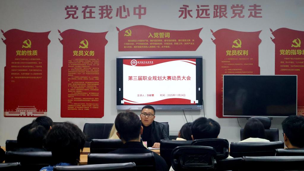 紧接着,张献慧书记就第三届职业规划大赛的具体安排进行了详尽说明,涵盖了报名途径、赛事环节设置以及评审细则等内容。他还特别分享了往届获奖学生的优秀规划案例,为同学们提供了宝贵参考。针对不同年级学生的阶段性特点,张书记给出了差异化的备赛指导:建议大一同学着重进行自我探索与专业认知,大二同学应聚焦于职业目标定位与核心能力提升,而大三同学则需注重规划方案的实践性与针对性。他鼓励全体同学牢牢把握大赛契机,主动将个人职业理想融入行业发展和国家社会需要,在备赛参赛的过程中不断锤炼自身的综合职业素养。