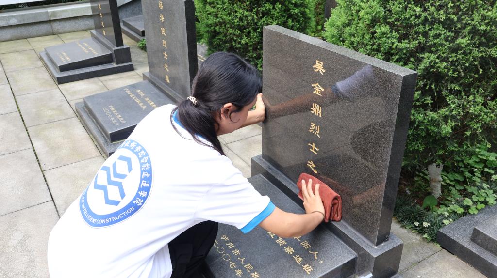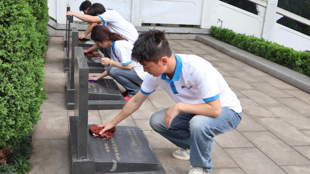 在祭扫的尾声,师生们手持工具,擦拭烈士墓碑、清扫陵园环境,用实际行动守护英烈安息之地,践行志愿精神,传递文明新风。